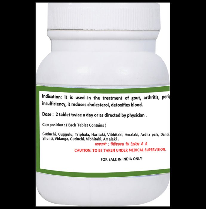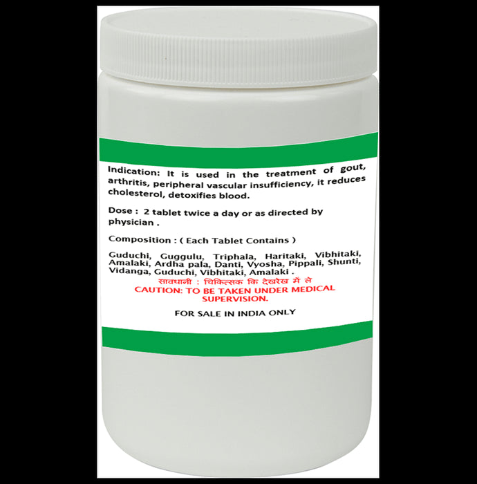 Composition : Guggulu, Guduchi, Triphala, Haritaki, Vibhitaki, Amalaki, Ardha Pala, Danti, Maricha, Pippali, Terminalia Belli (Ft./Bahera) 7.76mg, Zinzi Piper longum (Ft./Pippal) 5.81mg, Crataeva nurcala(Bark/Va officinale (Rz./Soanth) 5.81mg, Piper nigrum (Ft./Marica) 5.811 Chhal) 6mg, Cinnamomum Zeylonicum (Bark/Dalchini) 1.5 Elettaria cardamomum (Ft./Ela) 1.5mg, Cinnamomum (Leaves/Tejpatta) 1.5mg, Commiphora mukul (Gum/resin/Gugg