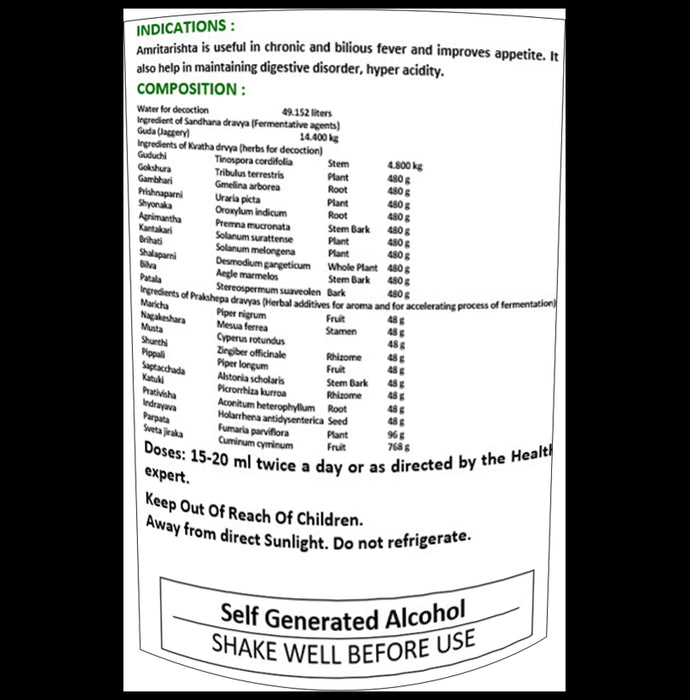 1ratti Amritarishta is used in the management of chronic fever, typhoid fever and other infectious diseases. It is a natural immunity booster and increases non-specific immunity. It helps the body to fight off bacterial as well as viral infections. Amritarishta is also beneficial for patients suffering from gout or elevated uric acid level, rheumatoid arthritis, poor appetite and hepatitis (jaundice).