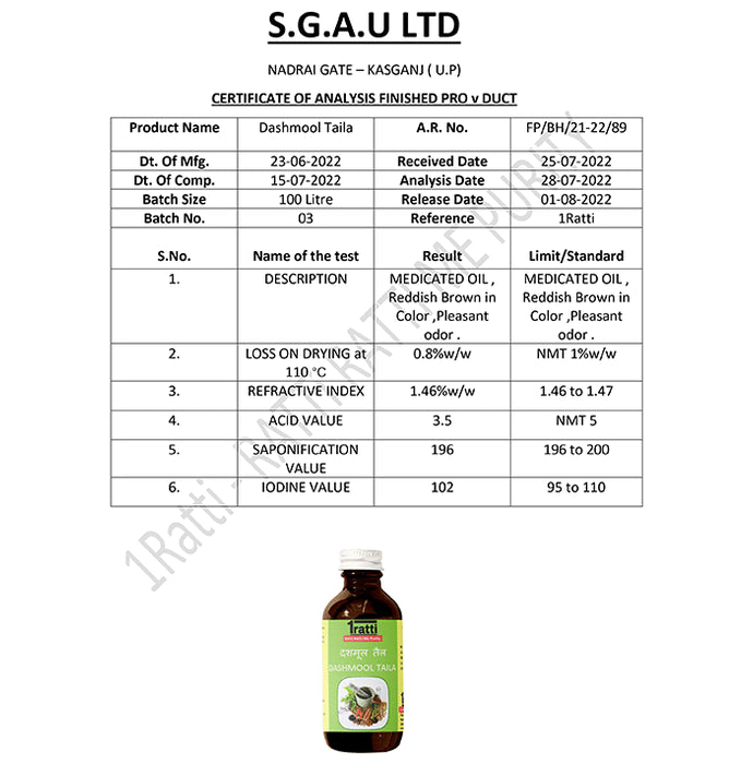 1ratti Dashmool Taila is a combination of potent ayurvedic ingredients. It works to help in cases of headaches, migraines and diseases associated with the ear, nose and throat.