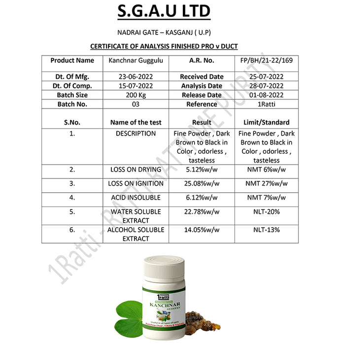 1ratti Kanchnar Guggulu Tablet1Ratti Kanchnar Guggulu Tablet contains Guggulu, which is a tree-based component that is effective in relieving pain. It helps in managing spasms and works as an expectorant. These tablets are to be used as a tonic with anti-inflammatory properties that can also manage ulcers before they get worse.