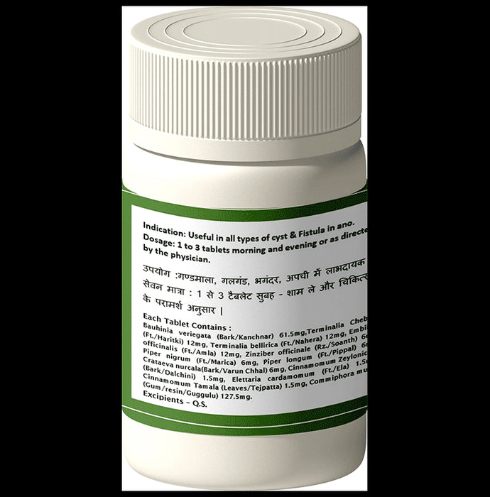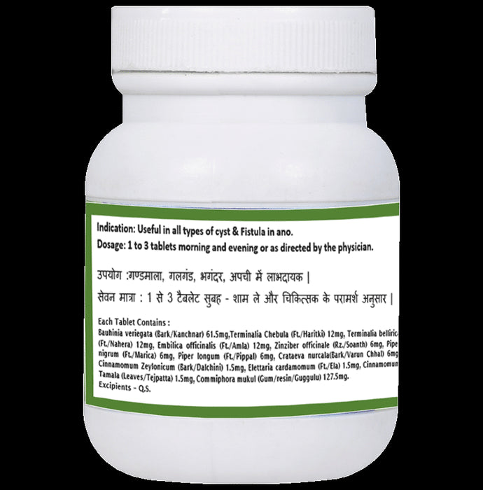 Composition : Triphala, Trikatu, Varuna, Dalchini, Ela, Tejpatra, Guggulu, Bauhinia veriegata (Bark/Kanchnar) 61.5mg, Terminalia Cheb (Ft./Haritki) 12mg, Terminalia bellirica (Ft./Nahera) 12mg, Embi officinalis (Ft./Amla) 12mg, Zinziber officinale (Rz./Soanth) 6 (Bark/Dalchini) 1.5mg, Elettaria cardamomum (Ft./Ela) 1.51 Crataeva nurcala(Bark/Varun Chhal) 6mg, Cinnamomum Zeylonic Cinnamomum Tamala (Leaves/Tejpatta) 1.5mg, Commiphora mu (Gum/resin/Guggulu) 127.5mg.