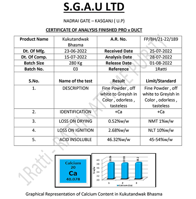 1Ratti Kukutandatwak Bhasma is an ayurvedic herbo-mineral formulation made with eggshells and changeri. Eggshell is made into ash (bhasma) form and is a rich natural source of calcium that helps to improve bone density and helps to improve bone and joint health. This supplement can be beneficial in maintaining women's health.