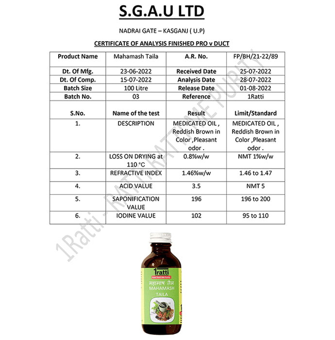 1ratti Mahamash Taila is one of the powerful ayurvedic oils widely used for many neurological conditions. The main ingredient of this oil is mash or urad (split black lentils), til tel(sesame oil), dashmool, ashwagandha, kachur, bala mool. It is used both for external and internal administration.