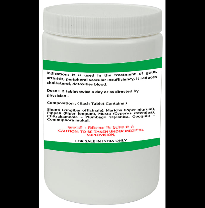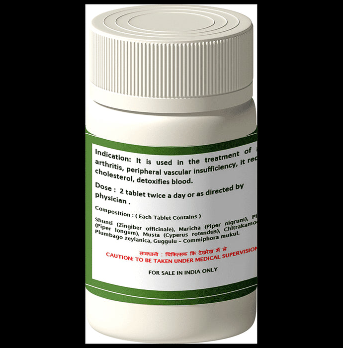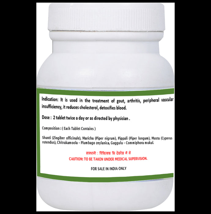 Composition : Sonth (Zingiber offcinale),Kali Mirch (Piper nigrum),Pippali (Piper longum),Chitrakmool (Plumbago zeylanica),Nagarmotha (Cyperus scariousus),Haritaki (Terminalia chebula)
