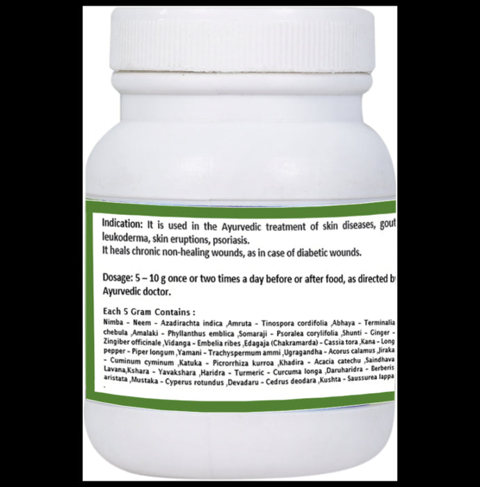 Composition : Nimba - Neem- Azadirachta indica, Amruta- Tinospora cordifolia, Abhaya - Terminalia chebula, Amalaki- Phyllanthus emblica, Somaraji-Poralea corylifolia, Shunti-Ginger- Zingiber officinalis, Vidanga- Embelia ribes, Edagaja (Chakramarda) classia tora, Kana- Longum piper-Piper longum, Yamini- Tachypermum ammi, Ugragandha- Acorus calamus, Jeeraka-Cuminum cyminum, Katuka -Picorrhiza kurroa, Khadira- Acacia catechu, Kshara- Yvakshara, Haridra- Turmeric- Curcuma longa, Daruharidra- Beberisis aristata, Mustaka- Cyprus rotundus, Devadaru- Cedrus deodara, Kushta- Sausurrea lappa