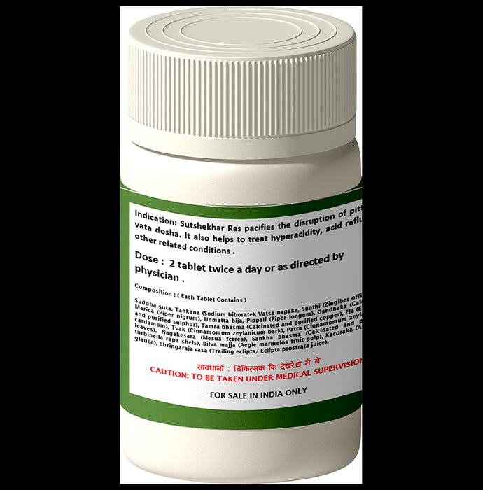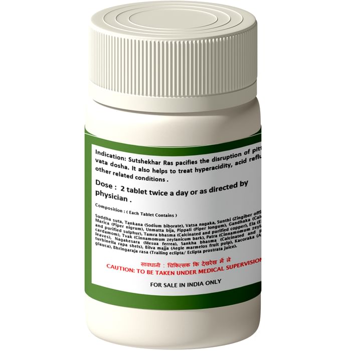 1ratti Sutshekhar Ras (60 Each): is an ayurvedic herbal formulation that is traditionally used to address various digestive and gastric issues. It contains a blend of natural ingredients known for their potential benefits in ayurveda.