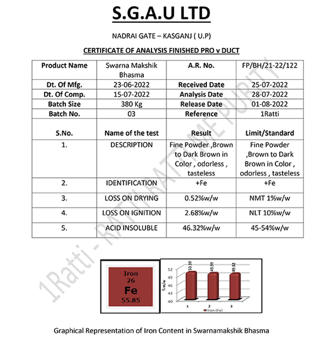1Ratti Swarna Makshik Bhasma is an ayurvedic mineral-based health supplement with swarnamakshika as the key ingredient, processed and purified with several botanical extracts. It not only helps in improving digestion but also helps in the purification of blood. It helps regulate blood sugar levels and also helps in boosting metabolism.