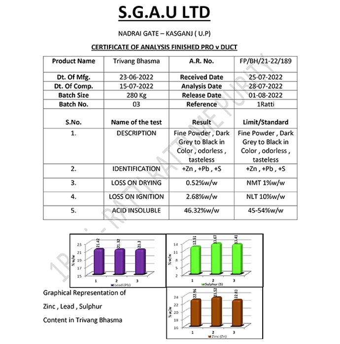 1Ratti Trivanga Bhasma is an ayurvedic mineral-based powder formulation with zinc, lead and tin as the key ingredients purified and processed in lemon juice. It is primarily used to manage blood sugar levels and urinary tract infections.