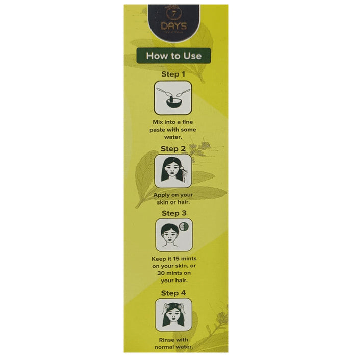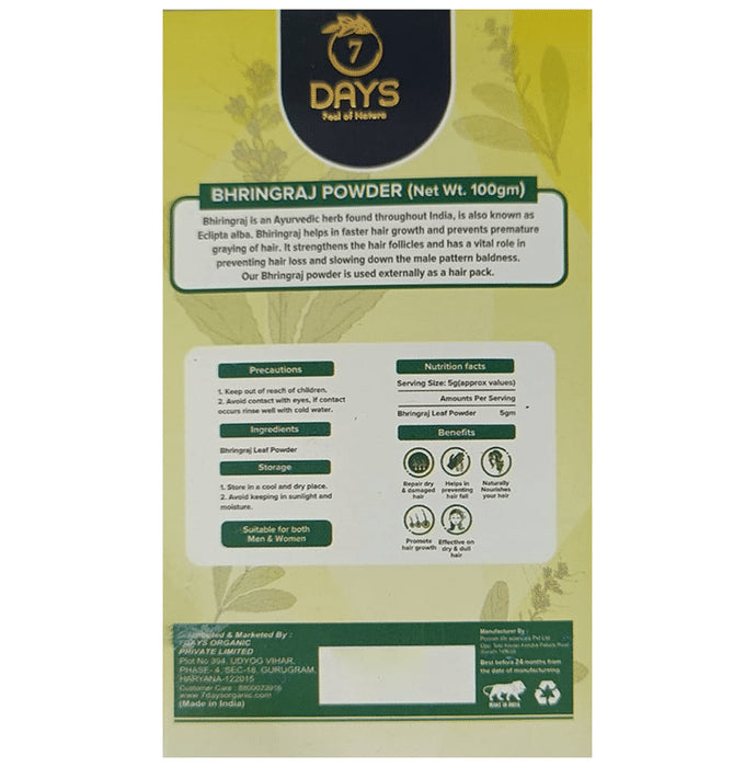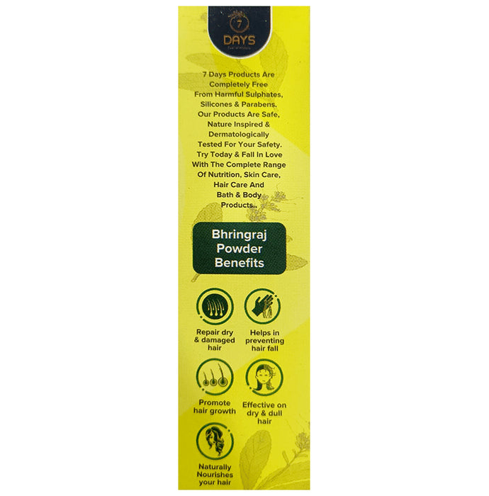 7Days Bhringraj PowderBhringraj is also known as kesharaj in ayurveda, which means ‘King of the hair’. It provides deep nourishment to the hair and scalp and stimulates new hair growth. It helps in balancing vata and removing excessive dryness from the hair. Bhringraj helps control premature greying of hair and rejuvenate hair due to its rasayana property. It has anti-ageing properties that help reduce the signs of ageing, like fine lines and wrinkles.