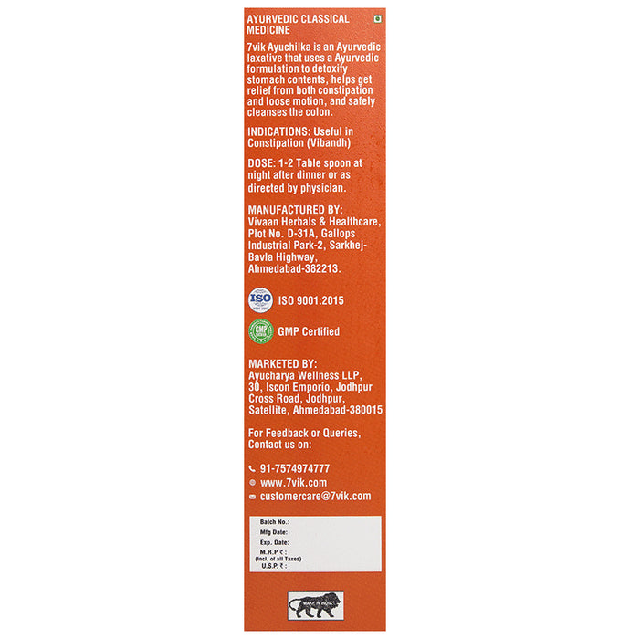 7vik Ayuchilka Isabgol Husk is an Ayurvedic laxative that uses a natural formulation to potentially help detoxify the stomach contents. It may help relieve constipation and loss of motion while safely cleansing the colon. It is non-habit forming, easy to consume, and flavoured with refreshing lemon to enhance the taste.