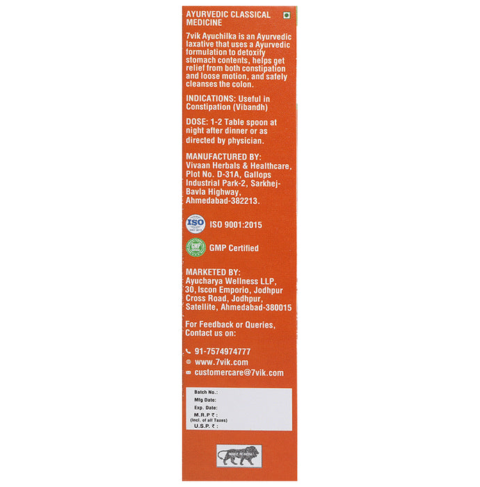 7vik Ayuchilka Isabgol Husk Organge is an Ayurvedic laxative that uses a natural formulation to potentially help detoxify the stomach contents. It may help relieve constipation and loss of motion while safely cleansing the colon. It is non-habit forming, easy to consume, and flavoured with refreshing lemon to enhance the taste.