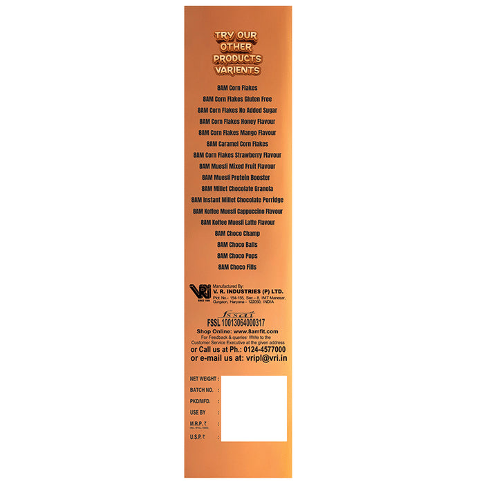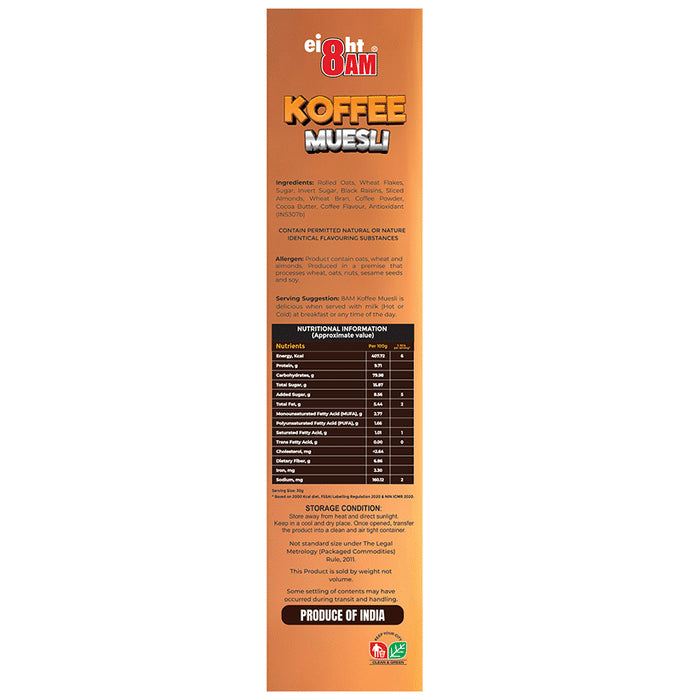 Eight AM Koffee Muesli Indulge in the rich and aromatic flavours of 8AM Koffee-Flavored Muesli, a delightful fusion of coffee indulgence and nutritious goodness. Carefully crafted with wheat flakes, rolled oats, wheat bran, and dried fruits, this muesli offers a satisfying breakfast experience that nourishes the body and tantalises the taste buds. Packed with protein-rich grains, and high fibre content, it provides a balanced and wholesome start to the day.