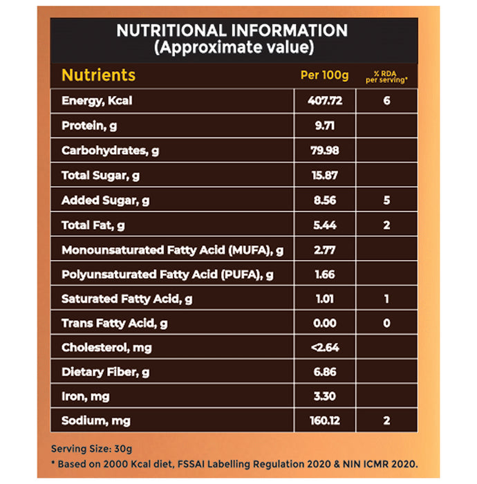 Composition : Rolled Oats, Wheat Flakes, Sugar, Liquid Glucose, Raisins, Sliced Almonds, Wheat Bran, Coffee Powder, Cocoa Butter, Coffee Flavour, Antioxidants (INS320)