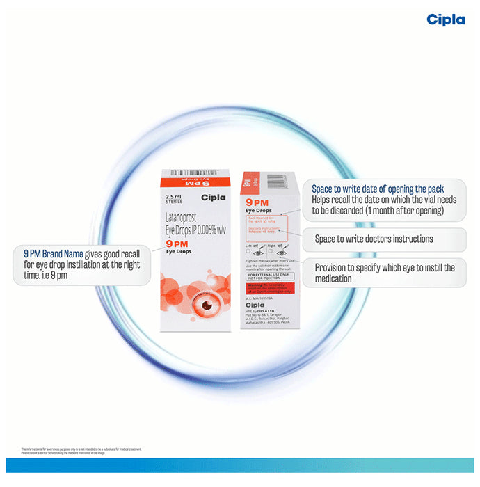 9 PM Eye Drop is a medicine used to reduce pressure in the eyes in people with glaucoma and ocular hypertension (high pressure in the eye). If the pressure in your eye is too high it can damage your sight, potentially leading to blindness. It works by helping fluid flow from inside the eye into the blood. 9 PM Eye Drop is suitable for adults and children and can be used by itself or in combination with other eye medicines to reduce pressure. Follow the instructions given by your doctor and use this medicine regularly to get the most benefit. If you stop using it, pressure in the eye could increase and damage your sight. Never use a bottle if the seal is broken before you use it for the first time. If you wear contact lenses, make sure you remove them before instilling and wait for at least 15 minutes before putting them back. The most common side effects include eyelashes changes, eye pain and sensitivity to light. It may also cause blurred vision, dryness in the eye, a gradual change in color of the eye, and other rare effects. If you get any side effects, talk to your doctor. Your doctor may be able to tell you ways of reducing or preventing some side effects or suggest another treatment. If your vision is blurred or you have other changes in sight for a time, do not drive until your vision is clear. This is usually a short-term side effect. Do not use this medicine if you are pregnant or trying to become pregnant, or if you are breastfeeding.