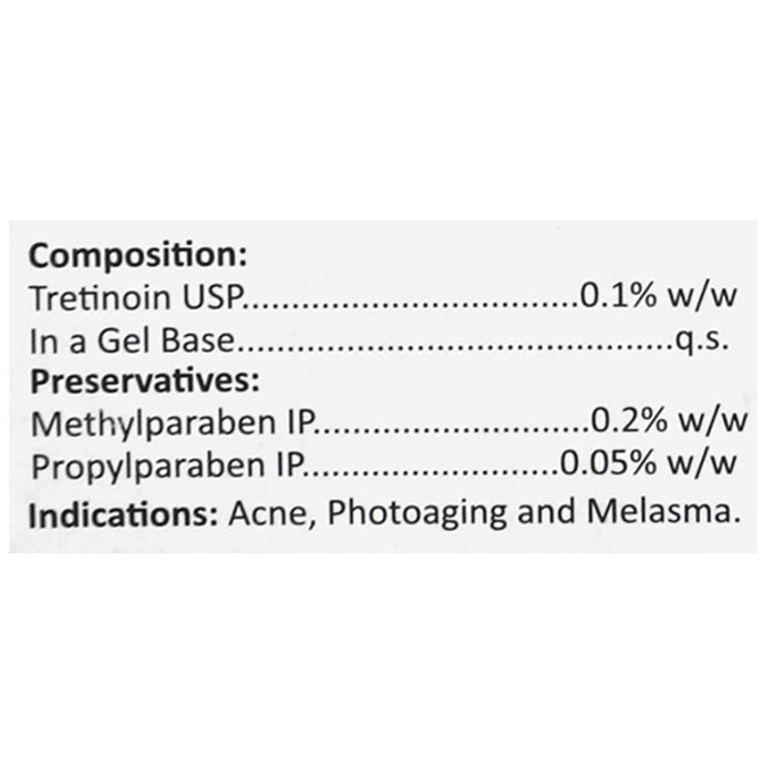 A-Ret 0.1% Gel is a form of vitamin A that is used to treat acne which appears as spots or pimples on your face, chest, or back. It also helps to smooth rough facial skin and to reduce fine wrinkles on the skin. A-Ret 0.1% Gel reduces excessive oil production of the skin. Ideally, a pinpoint application at nighttime is recommended for the duration prescribed by your doctor. The amount you need and for how long you need to take it will depend on what you are being treated for. You should normally wash and dry the affected area before applying a thin layer of this medicine. Follow your doctor’s instructions. You should not apply it to damaged or broken skin and avoid contact with your mouth, eyes, and nose. It may take several weeks for your symptoms to improve but keep using it regularly to get the most benefit. Consult your doctor again if you do not notice any improvement after a few weeks. Using more medicine or applying it more often than prescribed will not make it work any faster and may increase the side effects.The most common side effects include irritation, dryness, and redness of the skin. They are usually mild and improve as your body gets used to the medicine. Drink plenty of water and use moisturizer as it may lead to dryness of the mouth, lips, and eyes. Let your doctor know if these side effects bother you or do not go away. Serious side effects with this medicine are rare.This medicine may make you more sensitive to sunlight so you should limit exposure to the sun if possible. It may make your skin more fragile. It is advised, not to have any waxing (hair removal), or laser treatments during treatment. Pregnant women or women who are planning to get pregnant should not use this medicine as it can lead to birth defects.