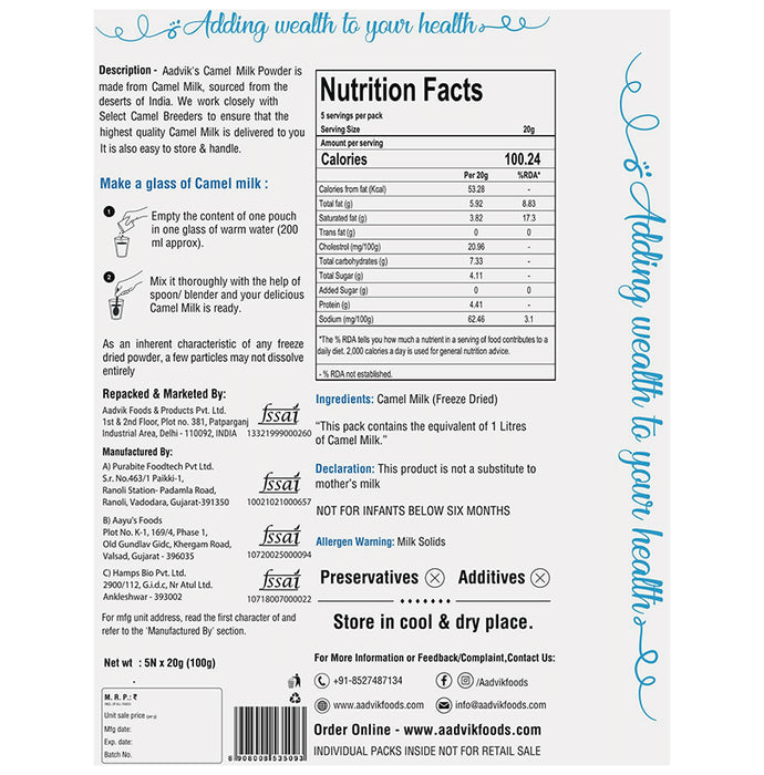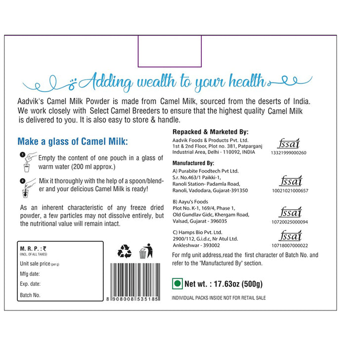 Aadvik Camel Milk Powder Sachet Freeze DriedAadvik brings to you premium and quality Camel Milk Powder. We source our Camel Milk from selective breeders who undergo proper training to ensure that the quality of the product is maintained. Aadvik Camel Milk Powder is made using the freeze-drying process that helps in retaining all the nutrients, even in the powder form. Try Aadvik Camel Milk Powder today!