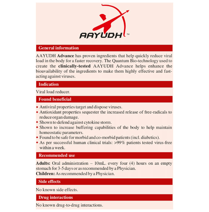 Aayudh Advance + Syrup Discover the remarkable benefits of Aayudh Advance, a certified Ayurvedic proprietary medicine designed to bolster your immune system against viral and bacterial threats. Crafted from natural botanical extracts, this health supplement is a highly effective viral load reducer and boasts potent anti-bacterial and anti-viral properties. Clinically tested and free from known adverse drug reactions, AAYUDH Advance offers a safe and reliable solution for maintaining optimal health.