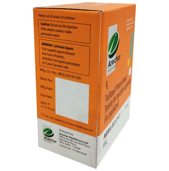 Abra Bound Suspension for Injection is an anti-cancer medication used for the treatment of breast cancer, pancreatic cancer and non-small cell lung cancer. It is given as an injection by a qualified medical professional. Your doctor will decide what dose is necessary and how often you need to take it. This will depend on what you are being treated for and may change from time to time. You should take it exactly as your doctor has advised. Taking it in the wrong way or taking too much can cause very serious side effects. It may take several weeks or months for you to see or feel the benefits but do not stop taking it unless your doctor tells you to.Some common side effects of this medicine include nausea, vomiting, and weakness. It may also cause serious side effects such as swelling of hands, lips, hair loss, and weight gain. To reduce these side effects your doctor may suggest some medication along with it. But, inform your doctor if you notice unexplained bruising or bleeding, sore throat, mouth ulcers, high temperature (fever). This medicine may reduce the number of blood cells (decrease red blood and white blood cells) in your blood, thereby, increasing the susceptibility to infections. Regular blood tests are required to check your blood cells and liver function.Before taking it, tell your doctor if you have heart disease, liver, or kidney problems or are taking any medicines to treat infections. Many other medicines can affect, or be affected by, this medicine so let your doctor know all medications you are using. This medicine is not recommended during pregnancy or while breastfeeding. The use of effective contraception by both males and females during treatment is important to avoid pregnancy.