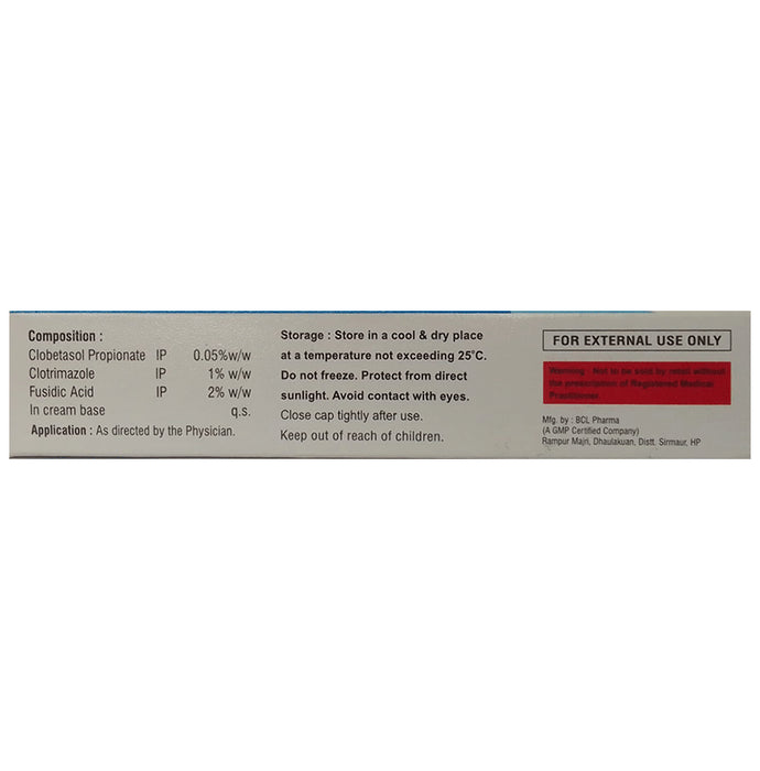 Composition : Clobetasol (0.05% w/w) + Clotrimazole (1% w/v) + Fusidic Acid (2% w/w)
