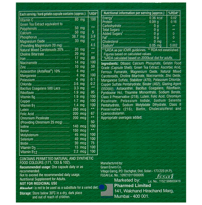 Composition : Green tea extract,Mixed Carotenoids,Lutein,Citrus bioflavonids,Choline,Probiotics