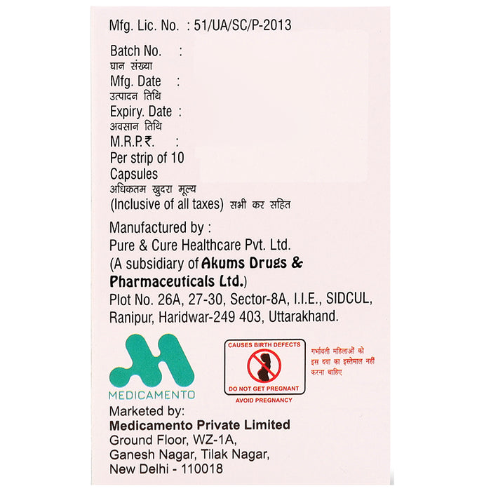 AC Rid Capsule belongs to a group of medicines called retinoids (vitamin A derivative). It is used to treat severe acne that has not responded to other treatments. AC Rid Capsule should be used in the dose and duration as advised by your doctor. Take it with food, preferably at the same time each day to avoid a missed dose. It may take several weeks for your symptoms to improve but keep taking the medicine regularly to get the most benefit. If you notice no improvement after a few weeks, see your doctor again.The most common side effects include dry skin, rash, and increased liver enzymes. They are not usually serious and often disappear after getting used to the medicine but if they bother you or do not go away, tell your doctor.AC Rid Capsule may make you more sensitive to sunlight so you should limit your exposure to the sun. It may also make your skin more fragile. Avoid any waxing (hair removal), or laser treatments during treatment. Additionally, it may cause dryness of the mouth, lips, and eyes so drink plenty of water and use a moisturizer. This medicine may lead to birth defects, do consult your doctor if you are pregnant or planning pregnancy.