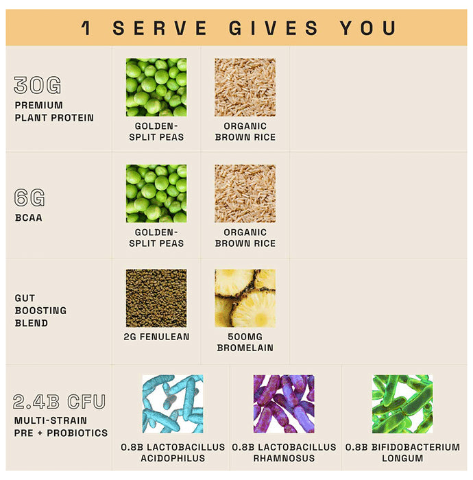 Composition : Premium Plant Protein Blend (Pea Protein Isolate and Brown Rice Protein Isolate), Nature-Identical Flavour (Kulfi), Gut Boosting Blend (Fenulean® (Fenugreek Fibre), Bromelain), Guar Gum (Plant Fibre) (INS 412), Acacia Gum (Plant Fibre) (INS 414), Sea Salt, Probiotic Blend, Stevia (Natural Sweetener, INS 960)