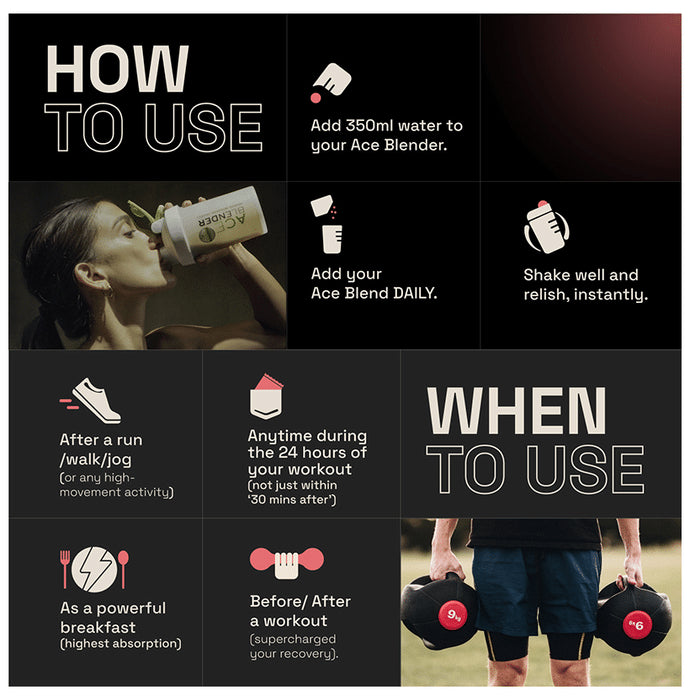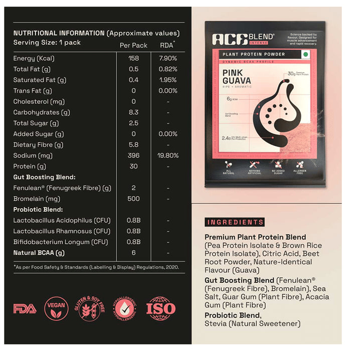 Ace Blend Intense Plant Protein Powder Sachet Sachet Pink Guava provides the body with 100 A-grade 30 gm plant-based protein blended with pineapple-based digestive enzymes, soluble and insoluble fibre, and 2.5B CFU of multi-strain pre and probiotics.