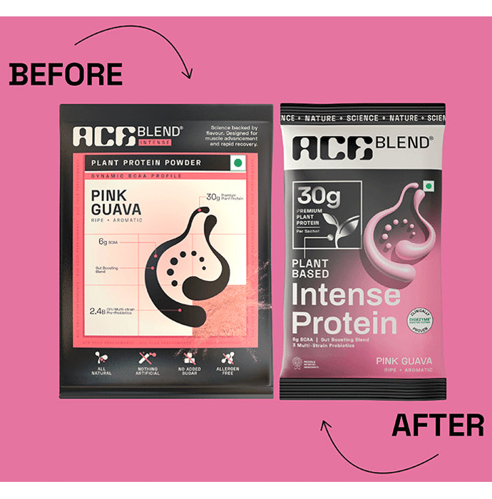 Ace Blend Intense Plant Protein Powder Sachet Sachet Pink Guava provides the body with 100 A-grade 30 gm plant-based protein blended with pineapple-based digestive enzymes, soluble and insoluble fibre, and 2.5B CFU of multi-strain pre and probiotics.