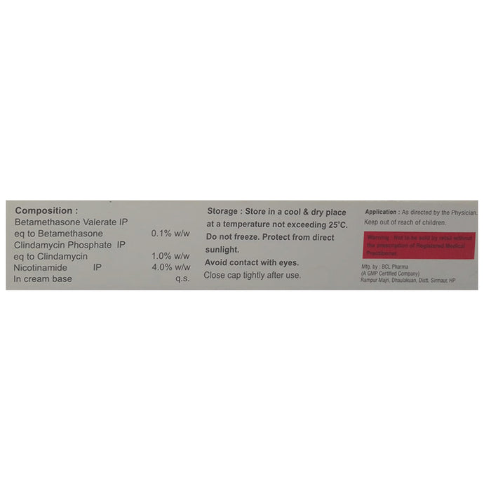 Composition : Betamethasone (0.1% w/w) + Clindamycin (1% w/w) + Nicotinamide (4% w/w)