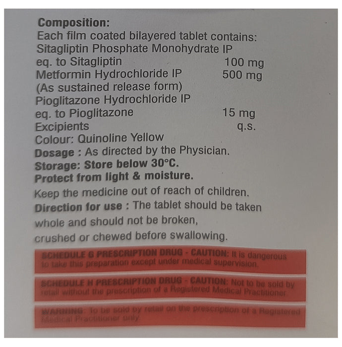 Composition : Metformin (500mg) + Pioglitazone (15mg) + Sitagliptin (100mg)