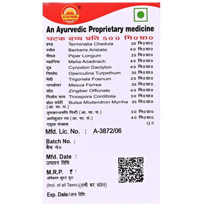 Composition : Terminalia Chedula,Berberis Aristata,Piper Longum,Melia Azadirach,Cynodon Dactylon,Operculina Turpethum,Trigonela Foenum,Mesua Ferrea,Zingiber Officnale,Tinospora Cordifolia,Bulsa Modendron Myrrha