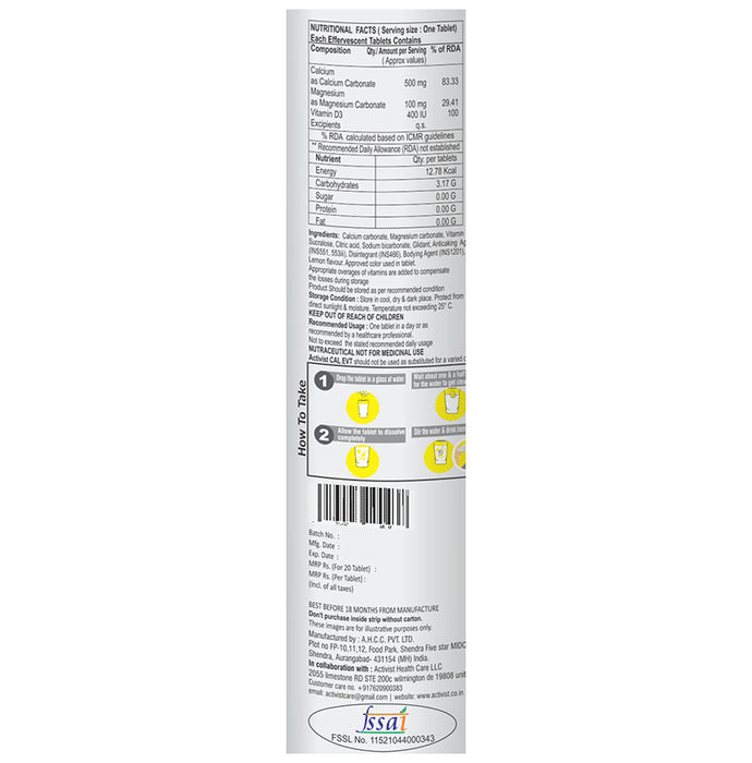 Activist CAL VIT Effervescent Tablet it is effervescent that helps supplement bone care for healthy bones. It allows complete bone care with calcium, magnesium, vitamin D3, vitamin C, and vitamin B6 that enhance the bone mineral density and can help prevent bone loss. Magnesium and zinc help in reducing inflammation, and developing and functioning immune cells. Calcium helps strengthen your bones and prevents bone fracture. It helps to boost energy levels and immunity.