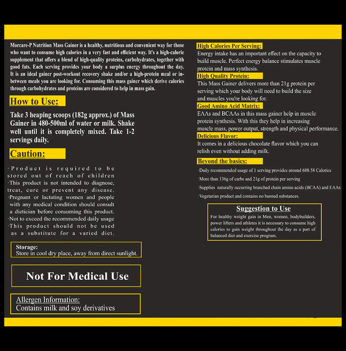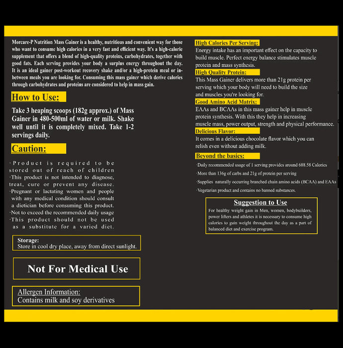 Acuraglobe Morcare-P Mor Mass Gainer Powder is a high-protein muscle gain supplement. It is rich in essential amino acids that repair the body tissues, prevent cell damage and promote growth and wellness of the body. It also helps to maintain a healthy immune system.