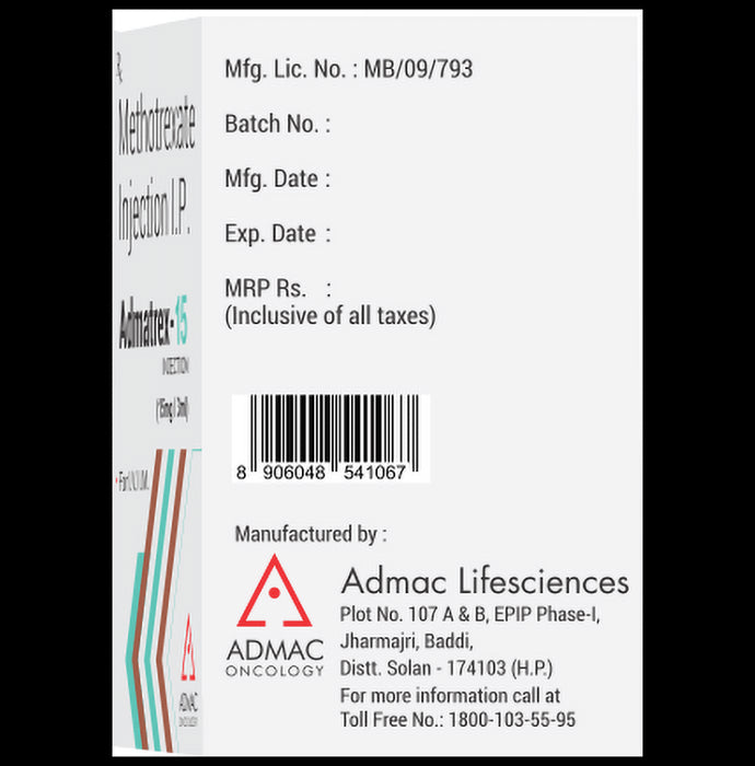Admatrex 15 Injection is a medicine used to treat rheumatoid arthritis where it helps prevent further joint damage. It is also used to treat severe forms of a skin disease called psoriasis, in the treatment of various cancers, and in the treatment of Crohn's disease. Admatrex 15 Injection is given under the supervision of a doctor or a nurse and should not be self-administered. It may be used by itself or in combination with other medicines. Your doctor will decide what dose is necessary and how often you need to take it. This will depend on what you are being treated for and may change from time to time. You should take it exactly as your doctor has advised. Taking it in the wrong way or taking too much can cause very serious side effects. It may take several weeks or months for you to see or feel the benefits but do not stop taking it unless your doctor tells you to. You should avoid drinking alcohol as it may increase your risk of liver damage.The most common side effects of this medicine include abdominal pain, indigestion, los of appetite, nausea, vomiting, tiredness, hair loss, and low blood platelets. Your doctor may advise you to take folic acid to reduce some of these. If they do not go away or get worse, tell your doctor. There may be ways of preventing or reducing these effects. It is powerful medicine, and some people may develop serious side effects while taking it. This medicine may lower your ability to fight infections and lead to problems with your blood, liver, or kidneys. Your doctor will advise you on regular blood tests to check for these.Before taking it, tell your doctor if you are pregnant, have stomach, liver, or kidney problems, or are taking any medicines to treat infections. Many other medicines can affect, or be affected by, this medicine so let your healthcare team know all medications you are using. This medicine is not recommended during pregnancy or while breastfeeding. It may harm your baby. You and your partner should avoid becoming pregnant or fathering a child for several months after your treatment with it has stopped. Your doctor may perform several tests such as blood tests, X-rays, and physical examinations both before and during treatment with this medicine.