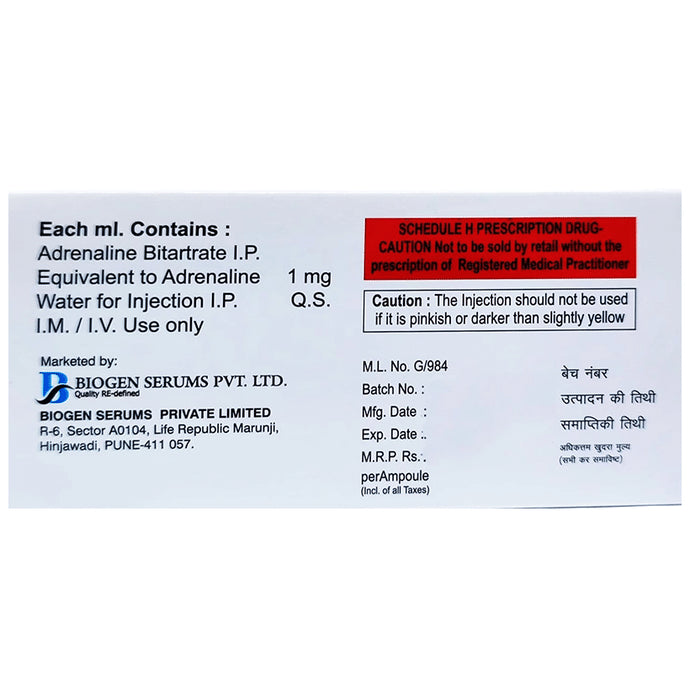Adrenaline Injection is used in the treatment of life-threatening emergencies like severe allergic reaction and cardiac arrest. It rapidly relieves breathlessness and wheezing by relaxing the airways. It also stimulates the heart and increases the blood pressure. Adrenaline Injection also improves the swelling of face or tongue and hives seen in allergic reaction. It is given under the supervision of a doctor. Doctor may closely monitor your blood pressure, heart rate or ECG till you became stable. You should continue all your other medicines that are advised by the doctor for your long-term treatment even after this injection.Common side effects associated with this medicine includes headache, restlessness, tremor, and palpitations. This medicine is used with caution for some people. Thus, if possible inform the doctor if you are suffering from any liver or kidney disease. Also, let your doctor know if you are pregnant or breastfeeding and about all the other medications that you are taking regularly.