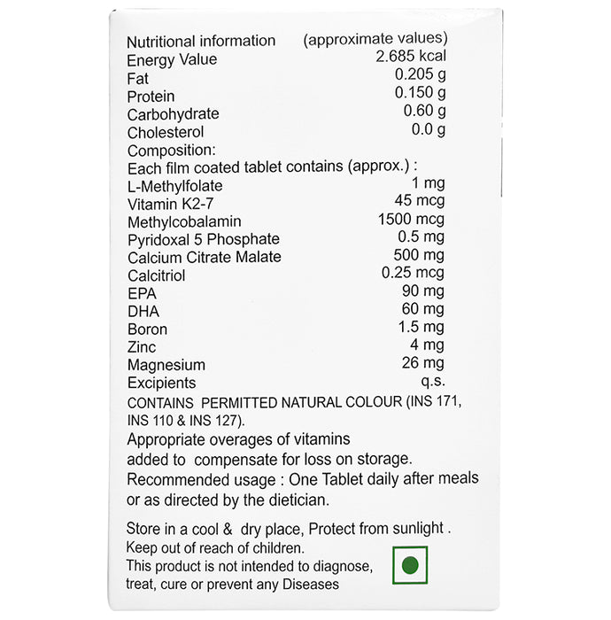 Composition : L-Methylfolate,Vitamin K2-7, Methylcobalamin, Pyridoxal-5-Phosphate, Calcium Citrate Malate, Calcitriol, EPA & DHA, Boron, Zinc, Magnesium