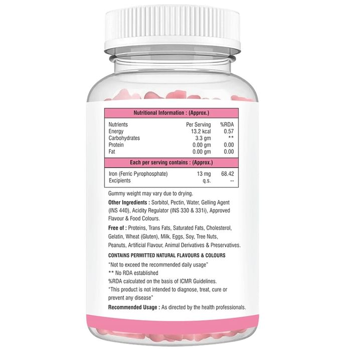 Composition : Iron (Ferric Pyrophosphate)13 mg per gummy,Other Ingredients: Sorbitol, Pectin Water, Gelling Agent (INS 440). Acidity Regulator (INS 330 and 331i), Approved Flavour and Food Colours