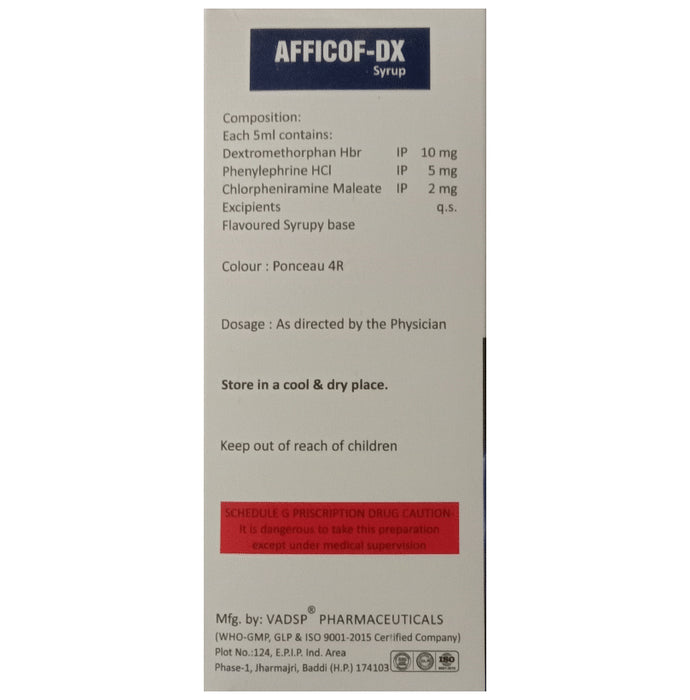 Afficof-DX Syrup is a medicine used in the treatment of common cold and cough. It can provide quick relief from cough and common cold symptoms like runny nose, stuffy nose, sneezing, watery eyes, and congestion or stuffiness. Afficof-DX Syrup is taken with or without food in a dose and duration as advised by the doctor. The dose you are given will depend on your condition and how you respond to the medicine. You should keep taking this medicine for as long as your doctor recommends. If you stop treatment too early your symptoms may come back and your condition may worsen. Let your healthcare team know about all other medications you are taking as some may affect, or be affected by this medicine.Common side effects of this medicine include headache, sedation, double vision, vomiting, diarrhea, dry mouth, and nausea. Most of these are temporary and usually resolve with time. Contact your doctor straight away if you are at all concerned about any of these side effects. This medicine can also cause sleepiness, so do not drive or do anything that requires mental focus until you know how this medicine affects you. Avoid drinking alcohol while taking this medicine as it can worsen your sleepiness.Never support self-medication or recommend your medicine to another person. It is beneficial to have plenty of fluids while taking this medication. Before taking this medicine, you should tell your doctor if you are pregnant, planning pregnancy or breastfeeding. You should also tell your doctor if you have any kidney or liver diseases so that your doctor can prescribe a suitable dose for you.