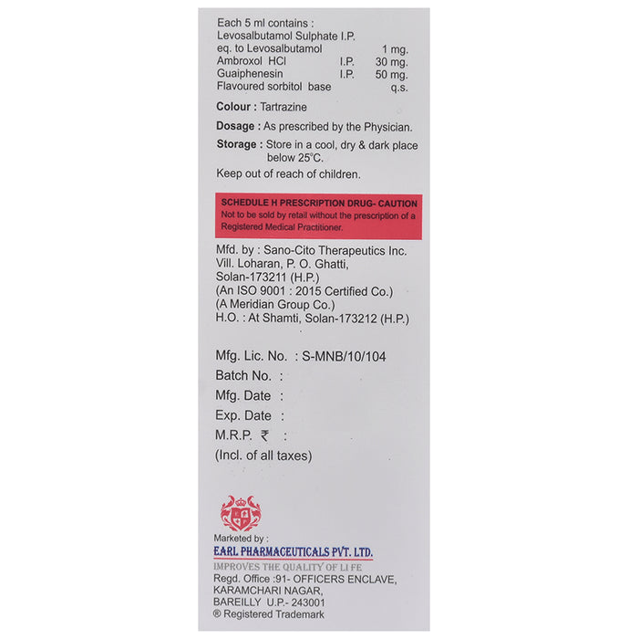 Composition : Levosalbutamol (1mg/5ml) + Ambroxol (30mg/5ml) + Guaifenesin (50mg/5ml)