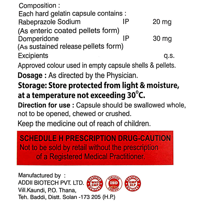 Composition : Domperidone (30mg) + Rabeprazole (20mg)
