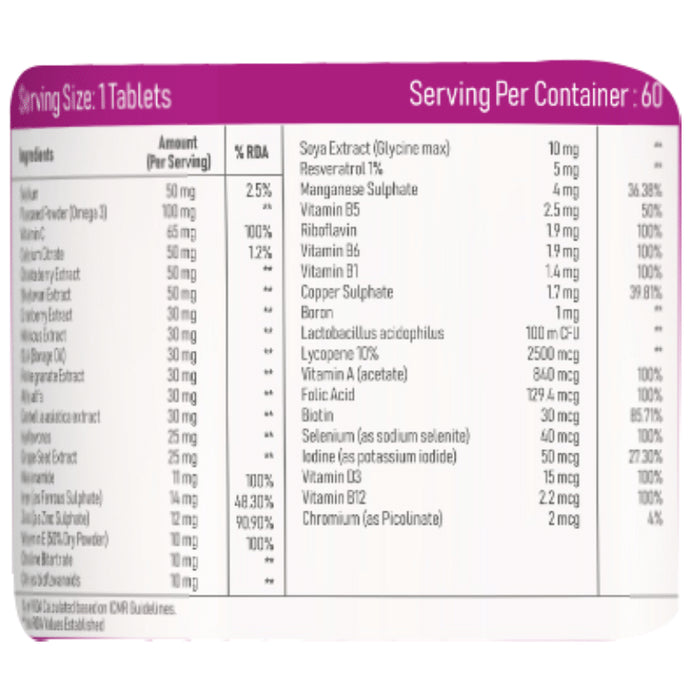 Aidvita Multivitamins One Daily for Woman Veg Tablet is a potent formula that comes with the goodness of multimineral, multivitamin, lycopene, ginseng, ginkgo biloba, grape seed, green tea, coffee extract, lactic acids, bacillus, and amino acids. It helps improve the overall immunity of the body. This formula helps increase energy levels and stamina. It sustains the wellness of the eyes and the skin. It is also enriched with antioxidants and removes oxidative stress. This formula also supports the wellness of the bones.