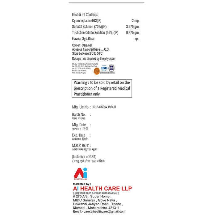 Composition : Cyproheptadine (2mg) + Tricholine Citrate (3.575gm) + Sorbitol (0.275gm)