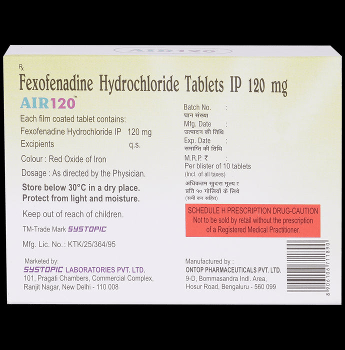 Air 120 Tablet is an anti-allergy medicine used in the treatment of allergic symptoms such as runny nose, congestion or stuffiness, sneezing, itching, swelling, and watery eyes. It also helps treat skin allergies with itching, redness, or swelling. Air 120 Tablet may be taken with or without food, in the dose and duration as advised by the doctor. The dose you are given will depend on your condition and how you respond to the medicine. You should keep taking this medicine for as long as your doctor recommends. Do not stop taking it without consulting your doctor.The most common side effects are headache, drowsiness, dizziness, and nausea. Most of these are temporary and usually resolve with time. Please consult your doctor if any of these side effects do not resolve or persist for a longer duration.Do not self-medicate or recommend your medicine to another person even if you see the similarity in symptoms. Consult your doctor to get the most benefit. Inform your doctor if you are suffering from any problems related to the kidneys, liver, or heart. Pregnant and breastfeeding mothers should not take this medicine without consulting a doctor.
