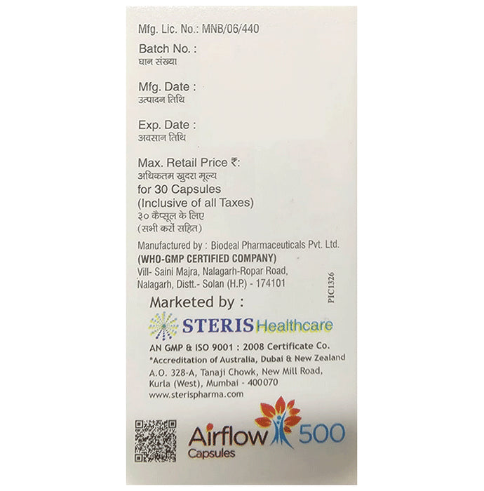 Airflow 500 Capsule is a combination of two medicines that opens the airways and makes it easier to breathe. It is used in the treatment of asthma (wheezing and shortness of breath) and chronic obstructive pulmonary disorder (a lung disorder in which the flow of air to the lungs is blocked). Your doctor will tell you how often you need to use your inhaler. The effect of this medicine may be noticeable after a few days but will only reach its maximum after a few weeks. This medicine must be used regularly to be effective, so go on taking it even if you don't have any symptoms. That means it’s doing its job. If you stop taking it your asthma and chronic obstructive pulmonary disorder (COPD) may get worse. It should not be used to relieve sudden asthma attacks. If an asthma attack occurs, use your quick-relief inhaler (reliever). To get the benefit from this medicine you need to make sure you get your inhaler technique right, otherwise, it does not work as well.The most common side effects are nausea, vomiting, respiratory tract infection, fungal infections in the mouth, headache, hoarseness of voice, sore throat, cough, musculoskeletal (bone, muscle, or joint) pain, and increased heart rate. If you get there, do not stop taking it but do talk to your doctor. You can help prevent some of these symptoms by rinsing your mouth and throat with water or brushing your teeth after using your inhaler. There are other, rarer side effects that can be serious. Talk to your doctor if you're worried about them. In general, you should be trying to avoid situations that make your asthma worse (your triggers) and try not to smoke.Ask your doctor whether it’s safe to take this medicine if you're pregnant or breastfeeding. Before taking it, you should tell your doctor if you have any kidney or liver diseases so that your doctor can prescribe a suitable dose for you.