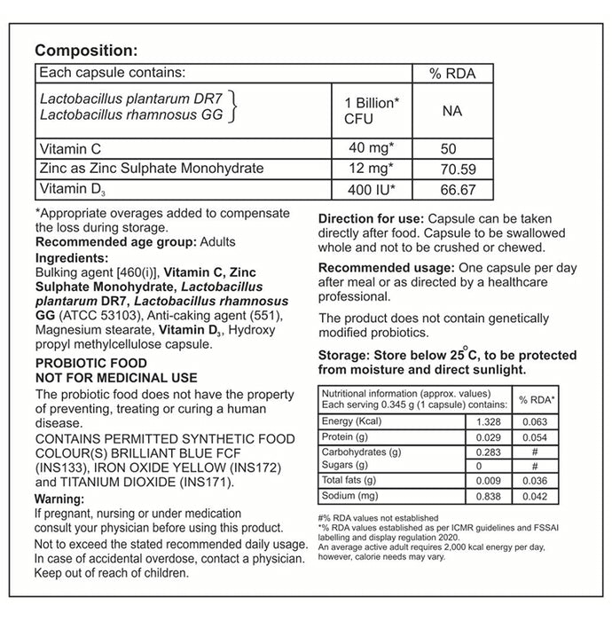 Composition : Lactobacillus plantarum,Lactobacillus rhamnosus,Vitamin C,Vitamin D3