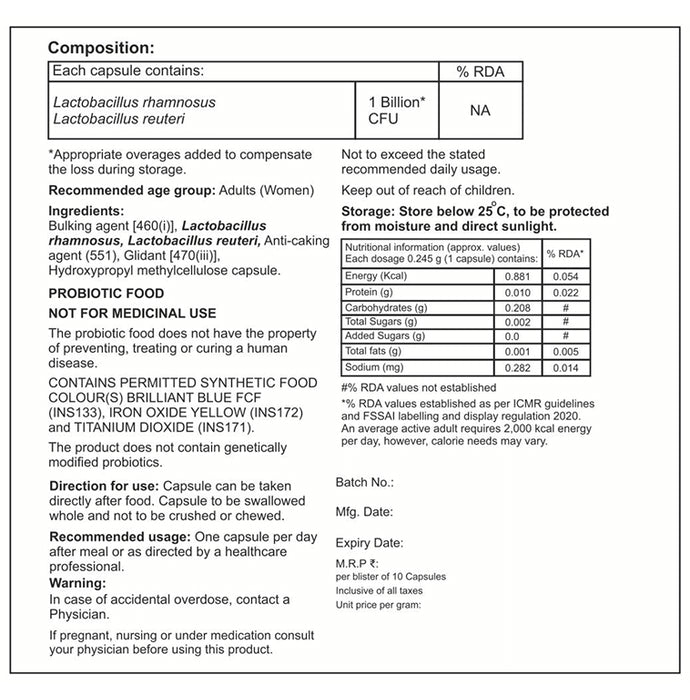 AIWO Probio-Women CapsuleIt is a dietary supplement formulated with 1 billion CFUs and probiotic strains that support women's overall health and well-being. It is enriched with lactobacillus rhamnosus, and lactobacillus reuteri produces the enzyme lactase. This enzyme breaks down the sugar lactose into lactic acid and may improve gastrointestinal tract, vaginal health, and breast health.