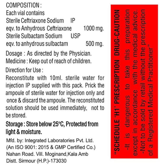 Composition : Ceftriaxone (1000mg) + Sulbactam (500mg)