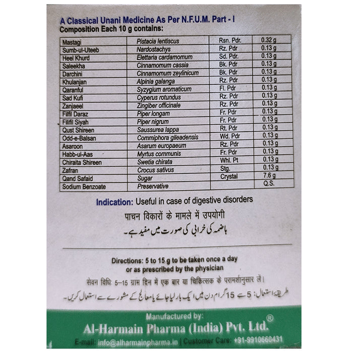 Composition : Sumb-ul-Uteeb, Heel Khurd Saleekha, Darchini Khulanjan, Qaranful, Sad Kufi, Zanjaeel, Filfil Daraz, Filifil Siyah, Qust Shireen, Odd-e-Balsan, Asaroon, Habb-ul-Aas, Chiraita Shireen, Zafran, Qand Safaid, Sodium Benzoate
