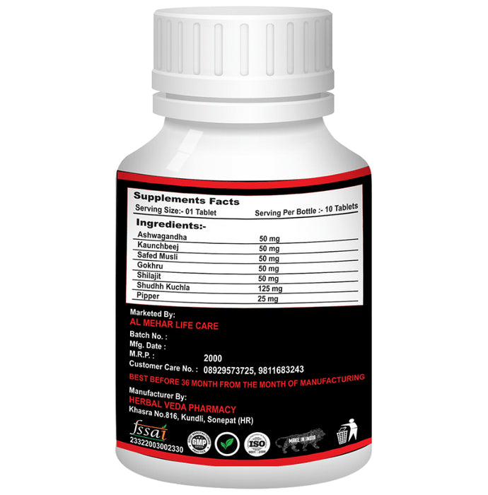 Composition : Shilajit,Kesar,Swarnabhasm,Jaiphal,Ashwagandha,Kalonji,Vidarikand,Jyotishmati,Safed musli,Gheekwar,Asgand nagori,Musli Siah