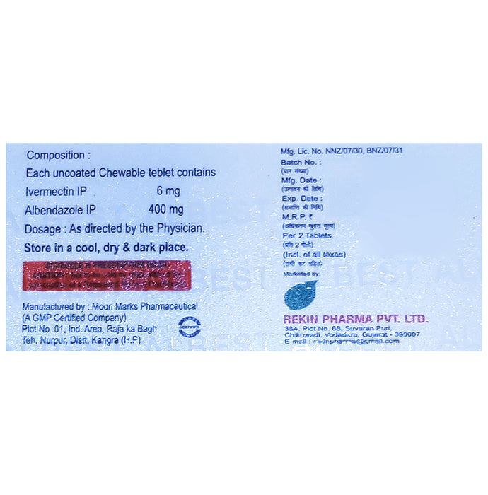 Albest Tablet is a combination medicine that is used in the treatment of parasites and worm infestations in the body. It fights against the worms to treat the infection. Albest Tablet is a prescription medicine. It is advised to take it as per the prescription. It can be taken with or without food, but it must be taken at a fixed time to ensure better efficacy. Do not consume more than the recommended dose, as this may have harmful effects on your body. If you miss a dose, take it as soon as you remember. The course of the treatment must be completed even if you feel better. Sudden discontinuation of the treatment may affect the potency of the medicine.Some common side effects of this medicine are nausea, vomiting, diarrhea, flatulence, etc. If any of the side effects get aggravated, you must consult your doctor immediately. If you experience any allergic reaction (rashes, itching, swelling, shortness of breath, etc.), you must seek immediate medical help.Before taking this medicine, you should tell your doctor if you are taking any medicines for any health condition. Pregnant or breastfeeding women should also consult with their doctor before taking it. Avoid drinking alcohol as it can cause excessive drowsiness with this medicine. It usually does not impair your ability to drive, but you should not drive if it makes you feel sleepy or dizzy. You must take adequate rest for a faster recovery, also take a healthy diet and drink plenty of water. Your doctor may ask for a few laboratory and diagnostic tests to know the effects of the medicine on your body.
